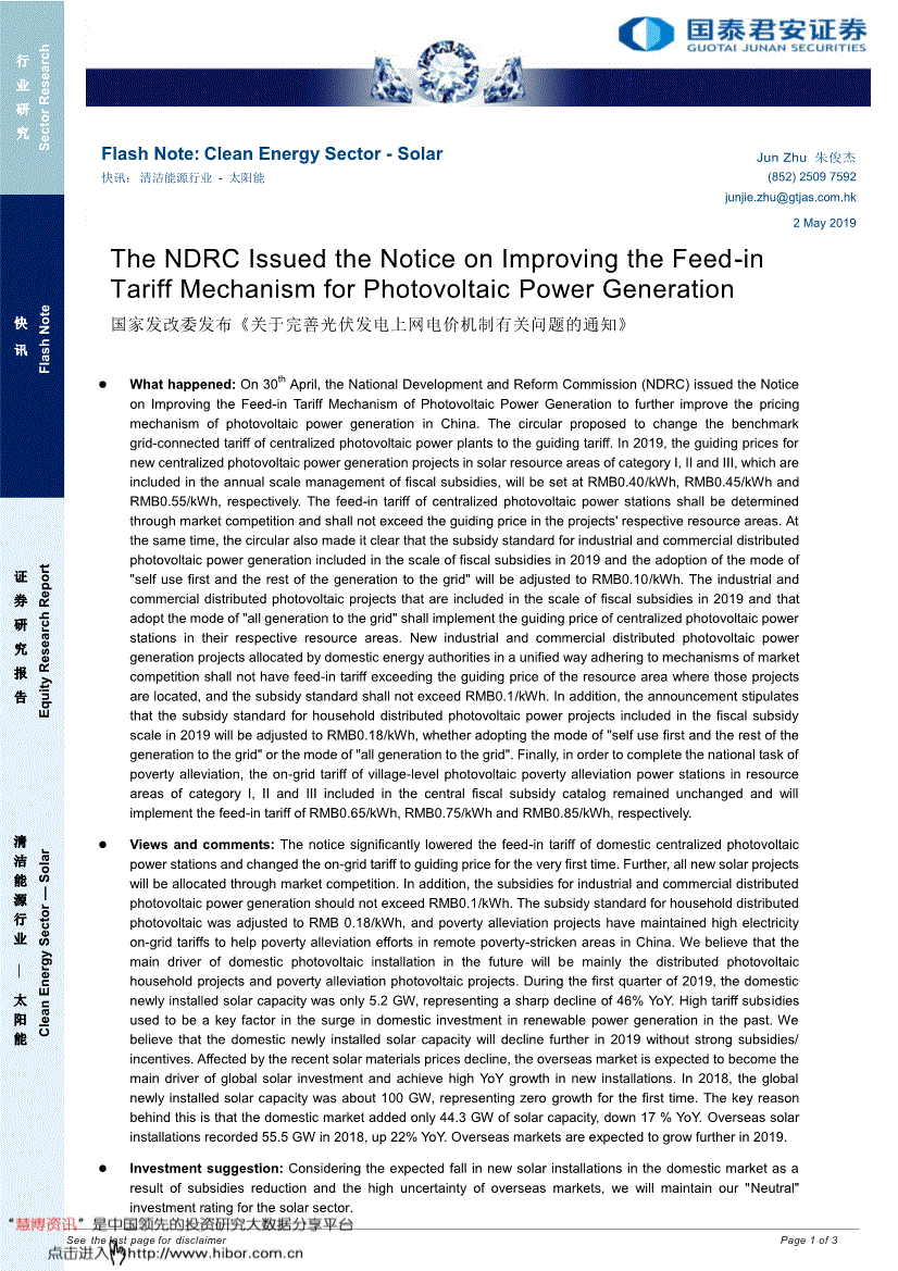 See the last page for disclaimer of 3 EquityResearchReport证券研究报告Sector ResearchFlashNote行业研究快讯证券研究报告[Table_LeftMargin] 清洁能源行业—太阳能CleanEnergySector —Solar Flash Note: Clean Energy Sector - Solar Jun Zhu朱俊杰快讯:清洁能源行业-太阳能2 May 2019 The NDRCIssued the Notice on Improving the Feed-in Tariff Mechanism for Photovoltaic Power Generation 国家发改委发布《关于完善光伏发电上网电价机制有关问题的通知》 What happened: On 30thApril, the National Development and Reform Commission (NDRC) issued the Notice on Improving the Feed-in Tariff Mechanism of Photovoltaic Power Generation to further improve the pricing mechanism of photovoltaic power generation in China. The circular proposed to change the benchmark grid-connected tariff of centralized photovoltaic power plants to the guiding tariff. In 2019, the guiding prices for new centralized photovoltaic power generation projects in solar resource areas of category I, II and III, which are included in the annual scale management of fiscal subsidies, will be set at RMB0.40/kWh, RMB0.45/kWh and RMB0.55/kWh, respectively. The feed-in tariff of centralized photovoltaic power stations shall be determined through market competition and shall not exceed the guiding price in the projects respective resource areas. At the same time, the circular also made it clear that the subsidy standard for industrial and commercial distributed photovoltaic power generation included in the scale of fiscal subsidies in 2019 and the adoption of the mode of self use first and the rest of the generation to the grid will be adjusted to RMB0.10/kWh. The industrial and commercial distributed photovoltaic projects that are included in the scale of fiscal subsidies in 2019 and that adopt the mode of all generation to the grid shall implement the guiding price of centralized photovoltaic power stations in their respective resource areas. New industrial and commercial distributed photovoltaic power generation projects allocated by domestic energy authorities in a unified way adhering to mechanisms of market competition shall not have feed-in tariff exceeding the guiding price of the resource area where those projects are located, and the subsidy standard shall not exceed RMB0.1/kWh. In addition, the announcement stipulates that the subsidy standard for household distributed photovoltaic power projects included in the fiscal subsidy scale in 2019 will be adjusted to RMB0.18/kWh, whether adopting the mode of self use first and the rest of the generation to the grid or the mode of all generation to the grid. Finally, in order to complete the national task of poverty alleviation, the on-grid tariff of village-level photovoltaic poverty alleviation power stations in resource areas of category I, II and III included in the central fiscal subsidy catalog remained unchanged and will implement the feed-in tariff of RMB0.65/kWh, RMB0.75/kWh and RMB0.85/kWh, respectively. Views and comments: The notice significantly lowered the feed-in tariff of domestic centralized photovoltaic power stations and changed the on-grid tariff to guiding price for the very first time. Further, all new solar projects will be allocated through market competition. In addition, the subsidies for industrial and commercial distributed photovoltaic power generation should not exceed RMB0.1/kWh. The subsidy standard for household distributed photovoltaic was adjusted to RMB 0.18/kWh, and poverty alleviation projects have maintained high electricity on-grid tariffs to help poverty alleviation efforts in remote poverty-stricken areas in China. We believe that the main driver of domestic photovoltaic installation in the future will be mainly the distributed photovoltaic household projects and poverty alleviation photovoltaic projects. During the first quarter of 2019, the domestic newly installed solar capacity was only 5.2 GW, representing a sharp decline of 46% YoY. High tariff subsidies used to be a key factor in the surge in domestic investment in renewable power generation in the past. We believe that the domestic newly installed solar capacity will decline further in 2019 without strong subsidies/ incentives. Affected by the recent solar materials prices decline, the overseas market is expected to become the main driver of global solar investment and achieve high YoY growth in new installations. In 2018, the global newly installed solar capacity was about 100 GW, representing zero growth for the first time. The key reason behind this is that the domestic market added only 44.3 GW of solar capacity, down 17% YoY. Overseas solar installations recorded 55.5 GW in 2018, up 22% YoY. Overseas markets are expected to grow further in 2019. Investment suggestion: Considering the expected fall in new solar installations in the domestic market as a result of subsidies reduction and the high uncertainty of overseas markets, we will maintain our Neutral investment rating for the solar sector. FlashNoteP See the last page for disclaimer of 3 Clean Energy Sector — Solar [Table_Margin1] 2May2 01 9[Table_Margin2] CleanEnergySector —Solar清洁能源行业—太阳能事件描述:国家发展改革委于4月30日印发了《关于完善光伏发电上网电价机制有关问题的通知》以进一步完善光伏发电价格形成的机制。