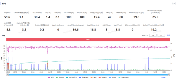 测试结果为:平均功耗59.6fps,稳帧指数1.1,1%LOW帧30.4fps。在开头刚进入游戏时有些许掉帧,应该是着色器编译导致的,编译完成后游戏运行就是几乎一条直线。