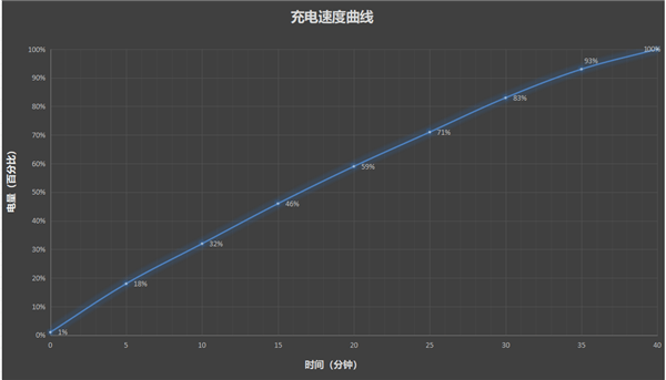 结果显示,开始第五分钟即充到18%,10分钟充至32%,20分钟充至59%,半小时83%,最后40分钟充满100%。在澎湃P3快充芯片的加持下,本次100W的充电速度值得点赞。