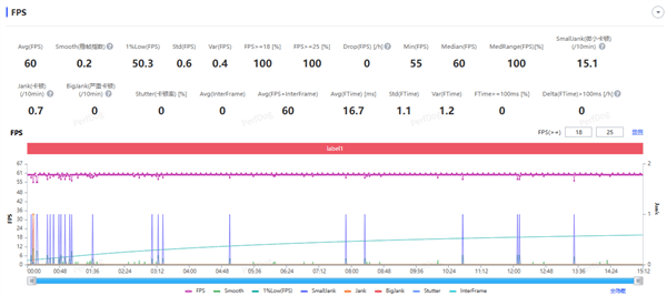 结果显示,平均游戏帧数为60fps,稳帧指数0.2,1%Low帧更是有50.3fps!《原神》在手机上从未如此的稳定,超满帧的顶级体验。